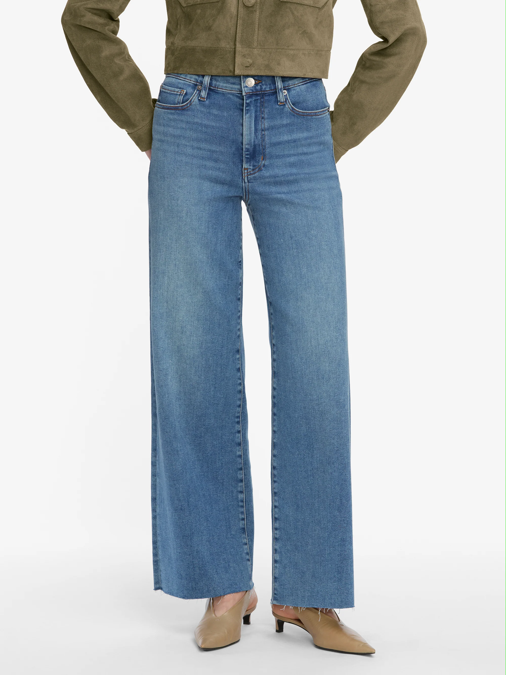 A FRAME introduction to the bestselling palazzo silhouette designed with a comfortable high-rise waist, fitted hip, and subtle wide-leg flare with raw edge. Crafted from an ultra-supple super stretch denim for smooth, all-day wear.