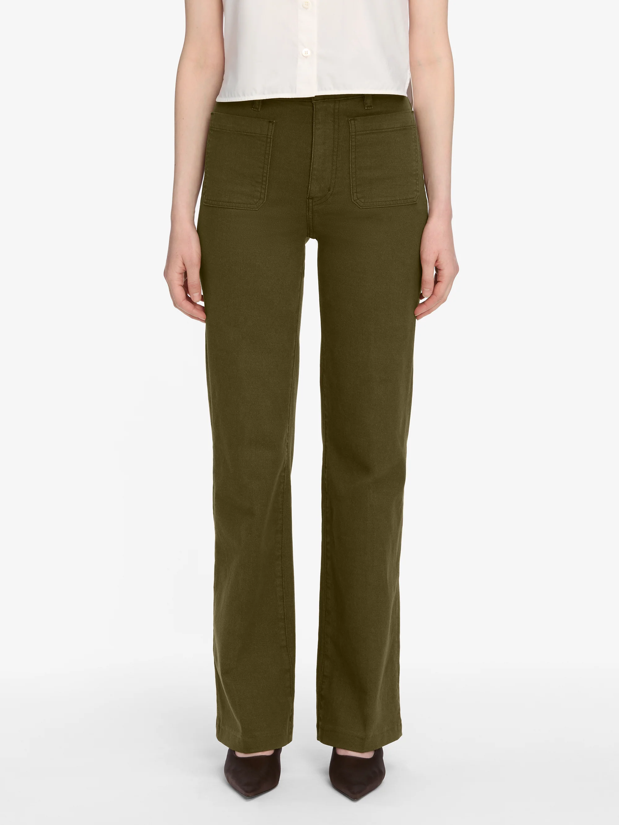 A '70s-inspired, high rise, wide leg trouser with a sleek silhouette and patch pockets. Made from super stretch twill, for polished comfort wherever your day takes you.