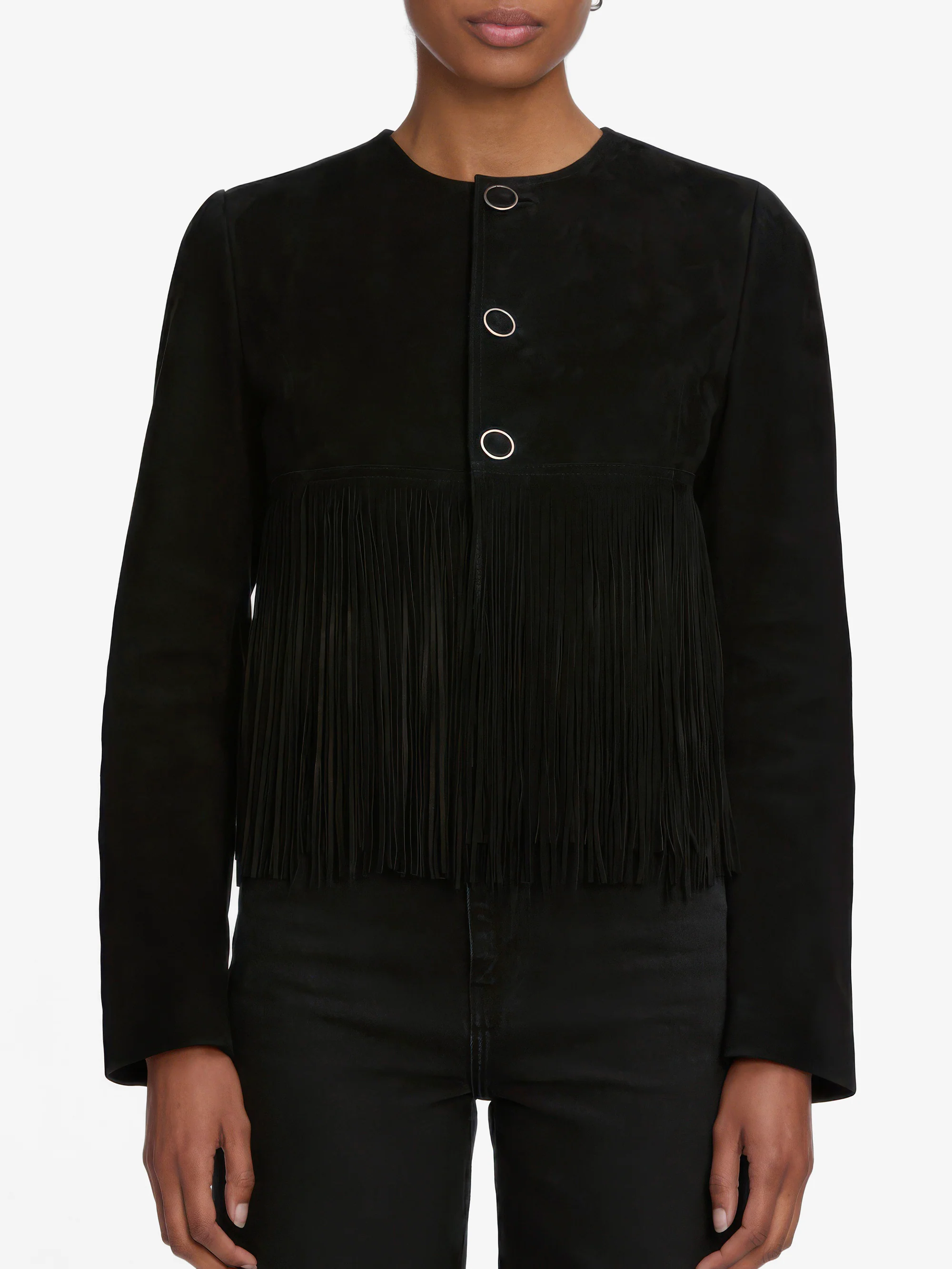 This luxe suede jacket features stacked, double layered fringe and Western-inspired buttons. A bold yet polished silhouette that adds high-impact texture to everyday looks.